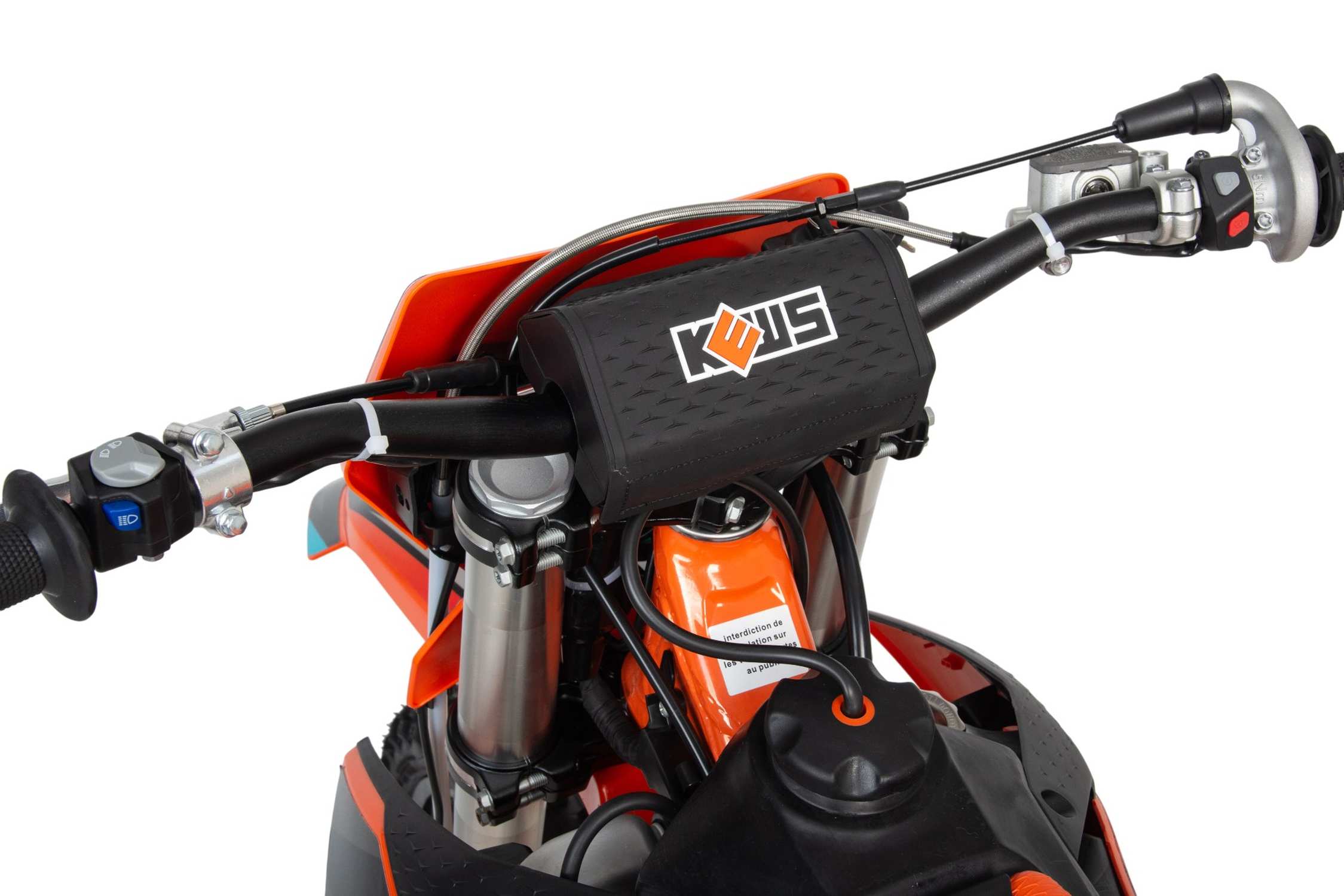 На кроссовый мотоцикл установлен усиленный алюминиевый руль (с вибропроставками) переменного сечения (28 мм в месте крепления и 22 мм на концах под грипсами) с низким подъёмом и с подушкой.