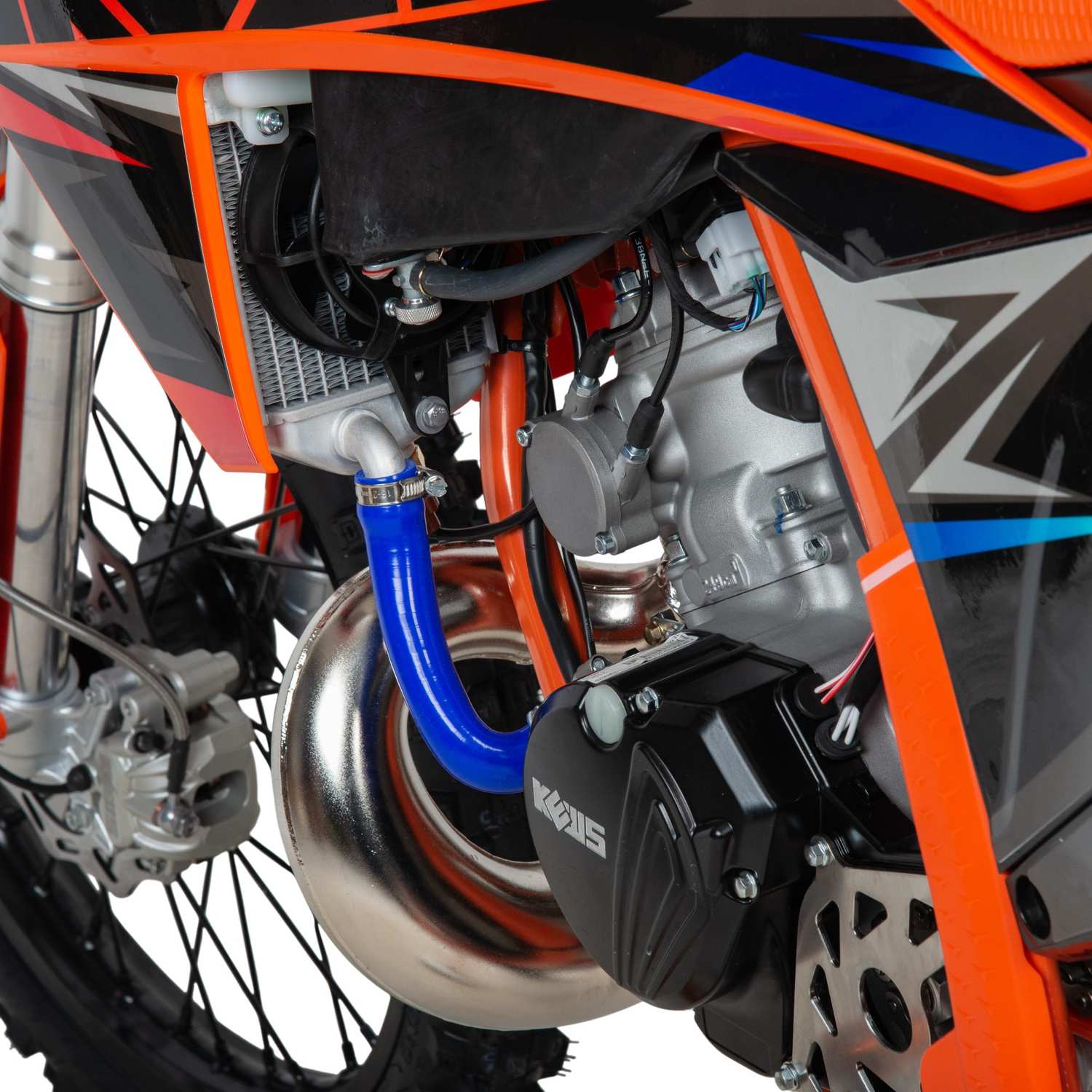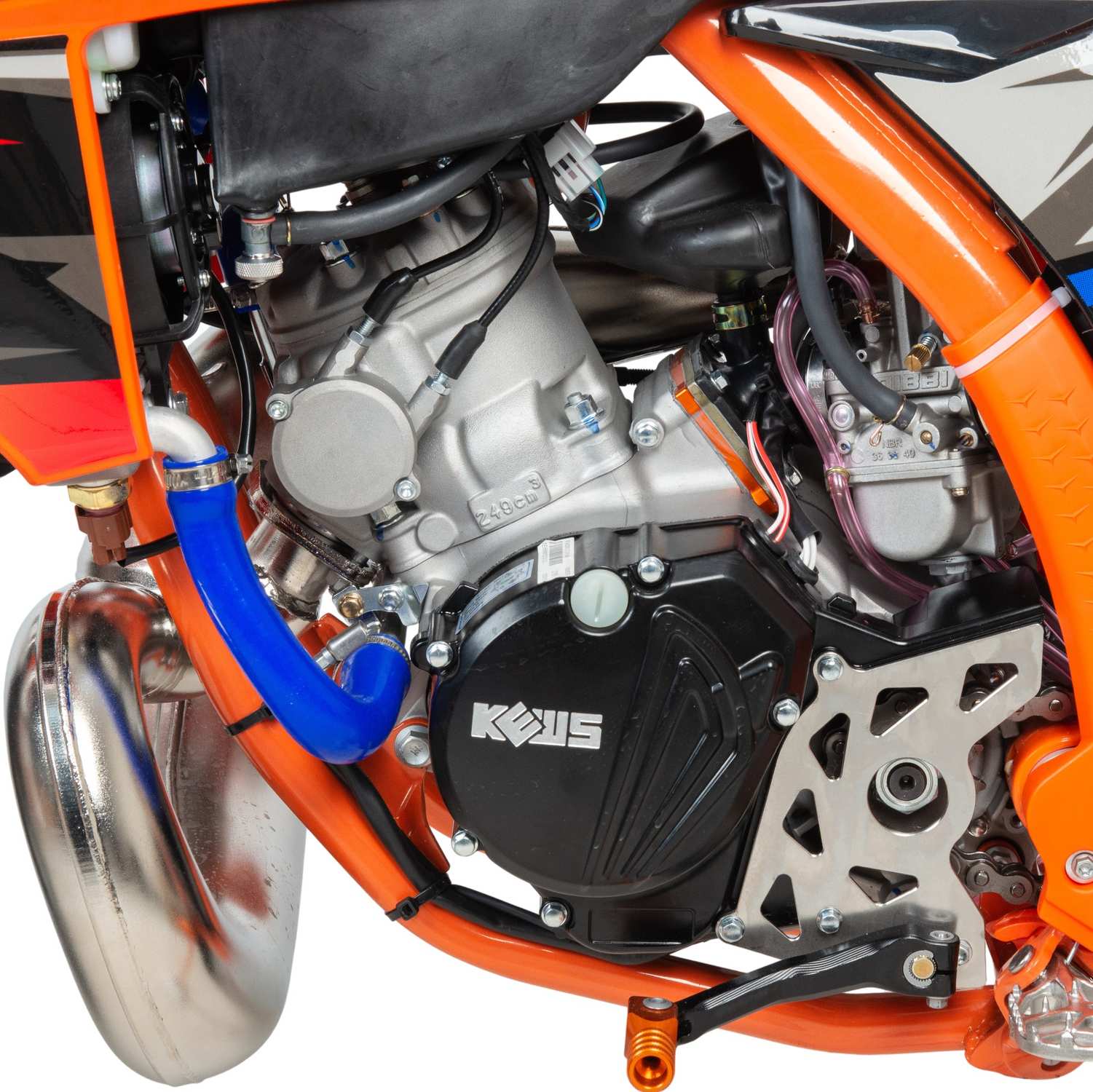 Полноценный кроссовый мотоцикл Kews K23 MT (250) 2-T с 2-х тактным двигателем 1E66MM с двумя радиаторами водяного охлаждения с вентилятором, для усиленного потока охлаждения, улучшенной защитой радиаторов, а так же карбюратором NIBBI PE 38(система PWK) 250 см³, мощностью 37 л.с., Идеален для езды по бездорожью и соревнований по мотокроссу. Подходит для любителей и профессиональных райдеров.