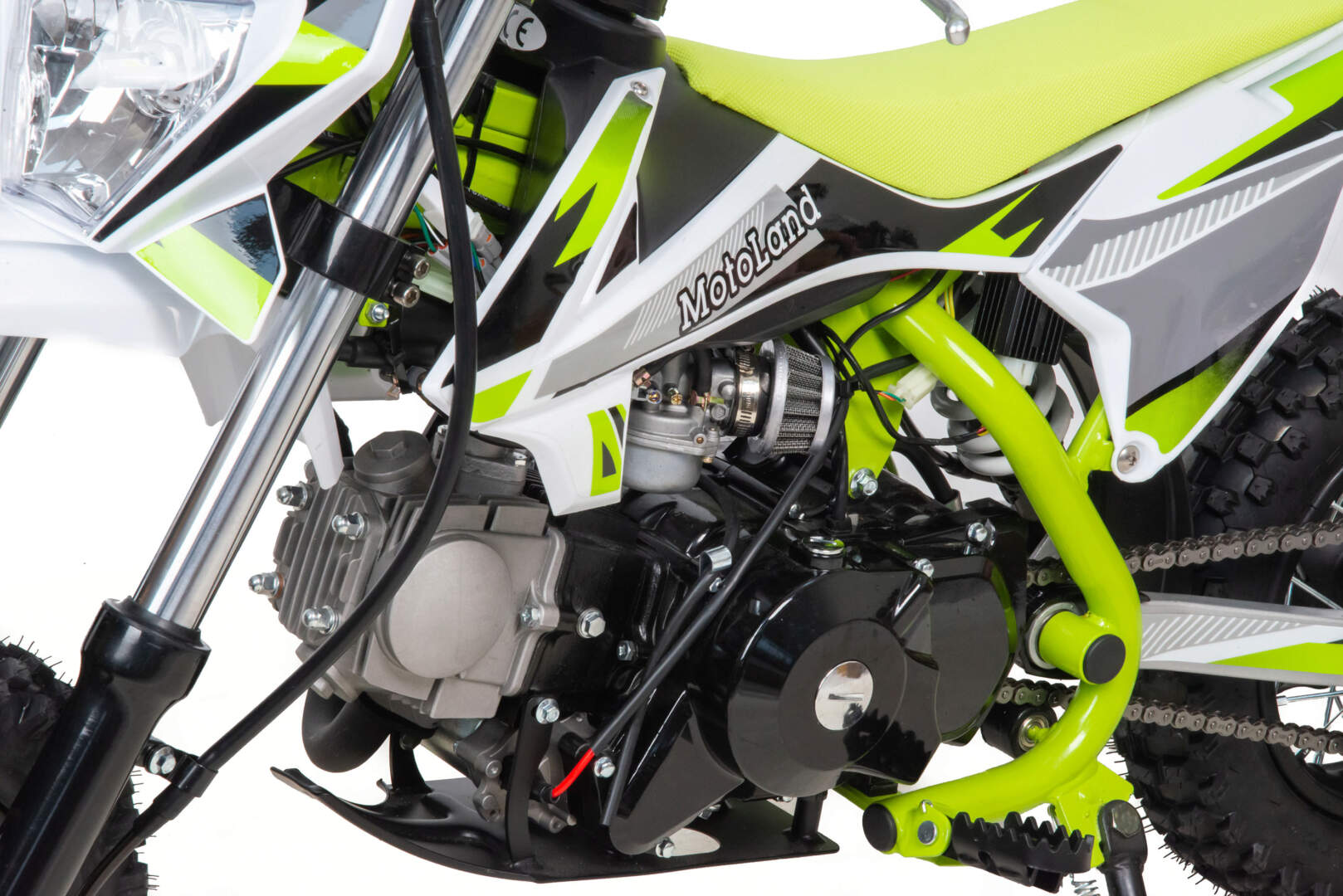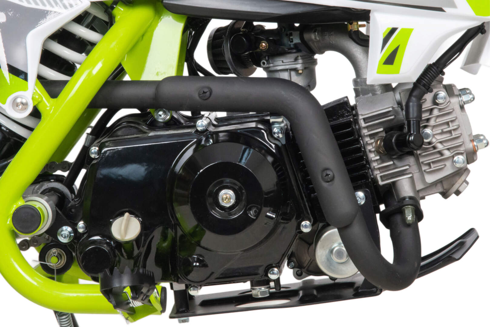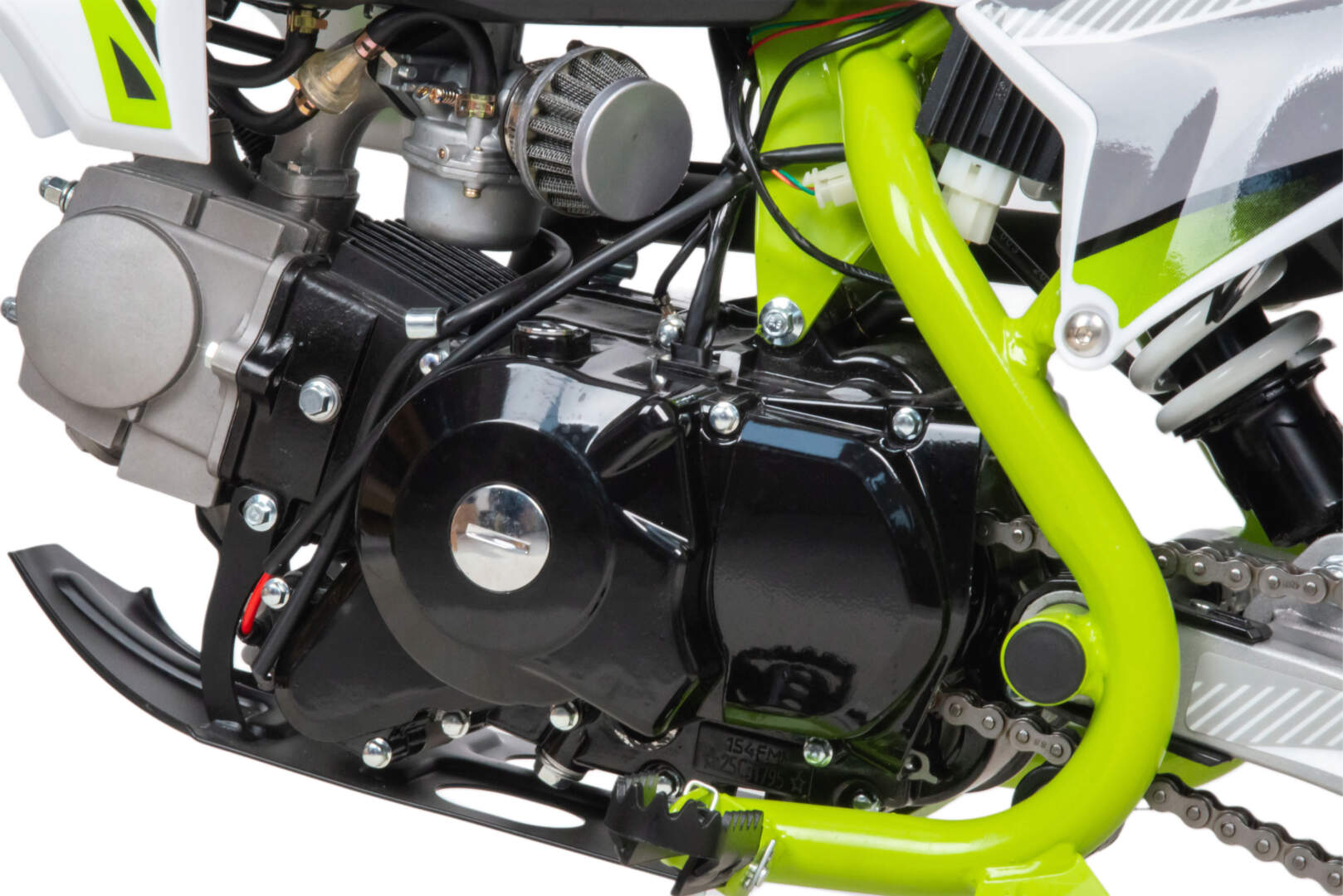 Питбайк оснащён карбюратором с фильтром нулевого сопротивления и одноцилиндровым четырёхтактным двигателем с воздушным охлаждением. Надёжный мотор мощностью 8 л. с. и объемом 110 см³. Система зажигания электронная (CDI), запуск двигателя - электростартер. Обода и маятник сталь, Есть светодиодная фара.
