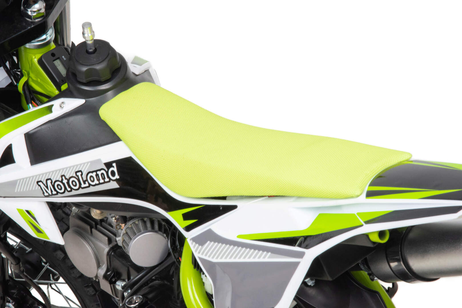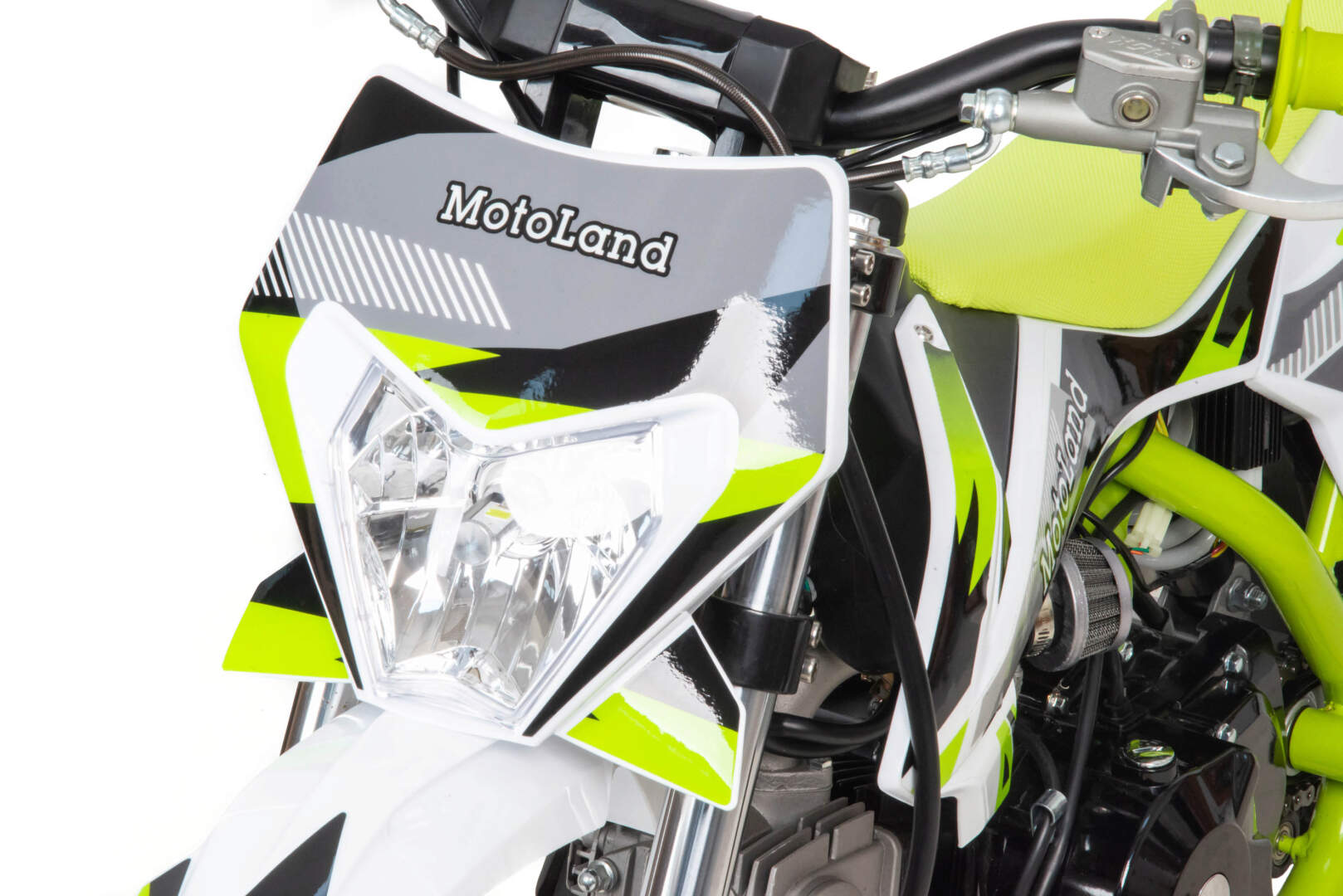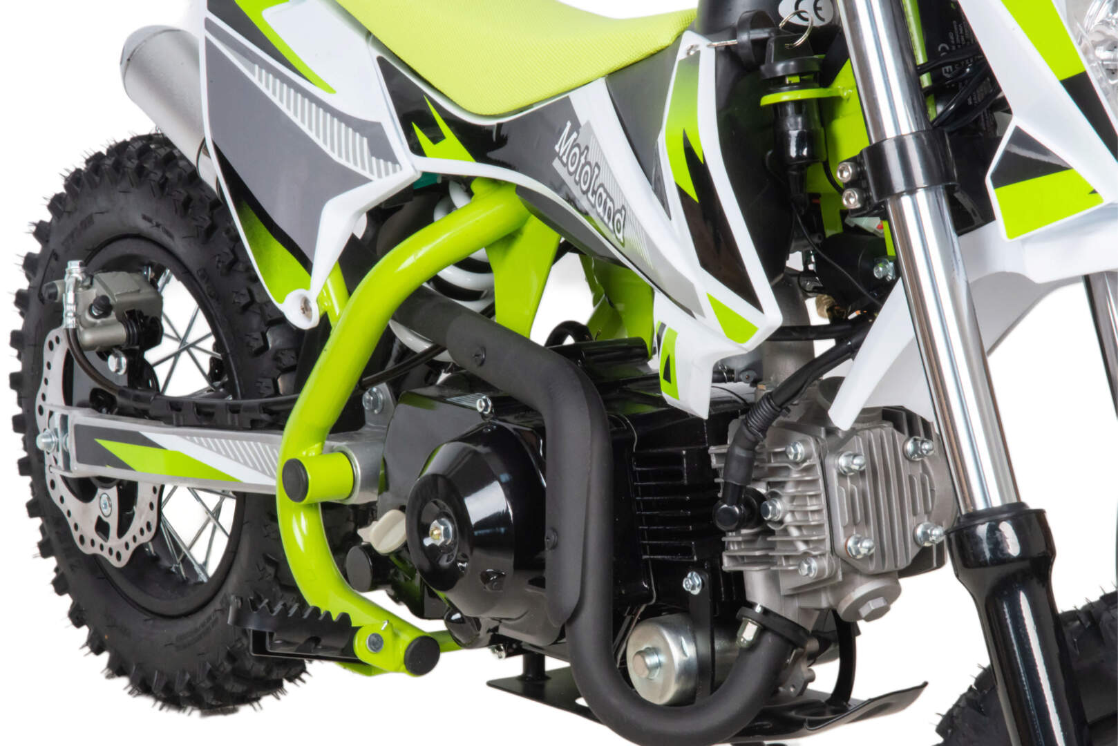 Питбайк оснащён карбюратором с фильтром нулевого сопротивления и одноцилиндровым четырёхтактным двигателем с воздушным охлаждением. Надёжный мотор мощностью 8 л. с. и объемом 110 см³. Система зажигания электронная (CDI), запуск двигателя - электростартер. Обода и маятник сталь, Есть светодиодная фара.