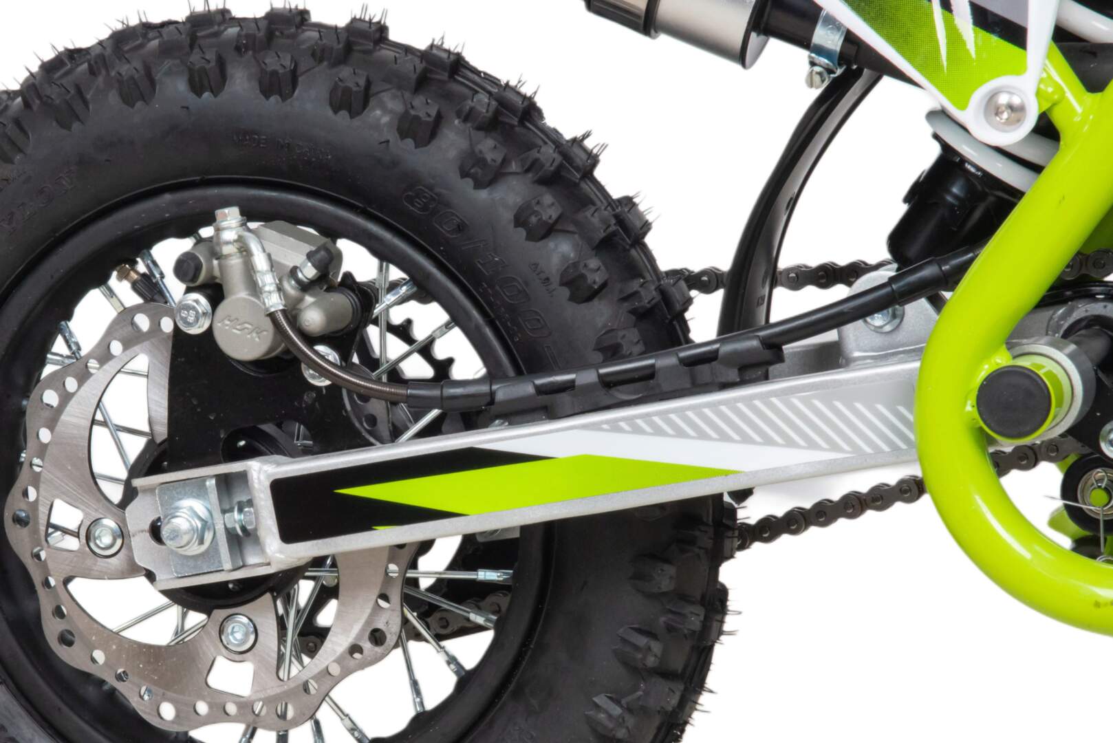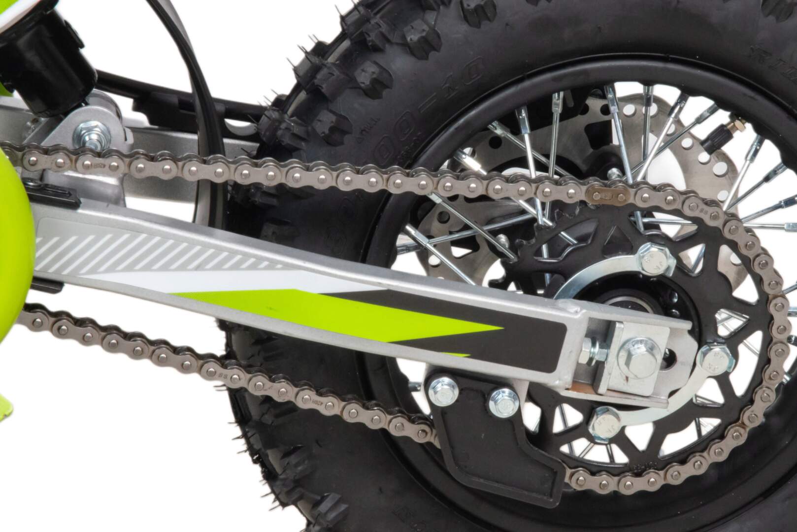 Питбайк весит всего 70 кг, при этом выдерживает вес до 80 кг. Оснащён спортивными траверсами, рама полудуплексная стальная, мотоцепь качественная. Колёса спицованные. Размер заднего колеса — 10 дюймов, переднего — 12 дюйм. Тормоза дисковые, передний тормозной суппорт двухпоршневой, задний — однопоршневой. Звезды: ведущ. на 13 зуб., ведомая на 39 зуб.